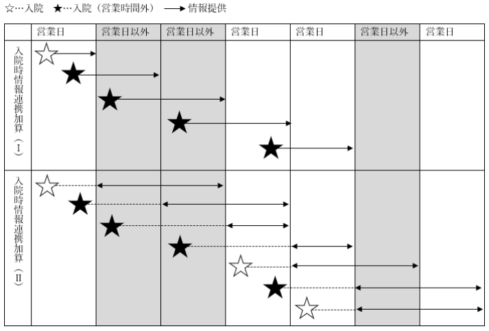 しかし、入院が営業時間外や営業日以外の場合、その日の内に情報提供することが難しいため、そういった場合には入院した日の翌日までに情報連携することで、入院時情報連携加算(Ⅰ)を算定することができます。