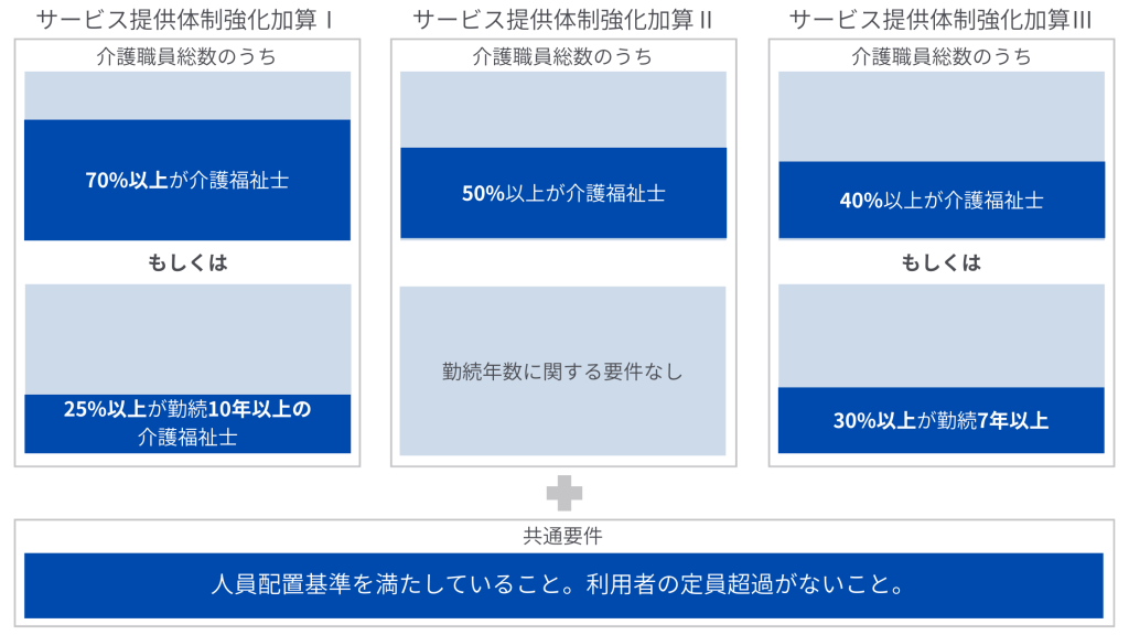 サービス提供体制強化加算は、質の高いサービスを提供する介護事業所が算定できる加算です。具体的には、介護福祉士の資格を有する職員の割合と、一定の勤続年数を超える職員の割合が要件を満たす場合に算定することができます。
