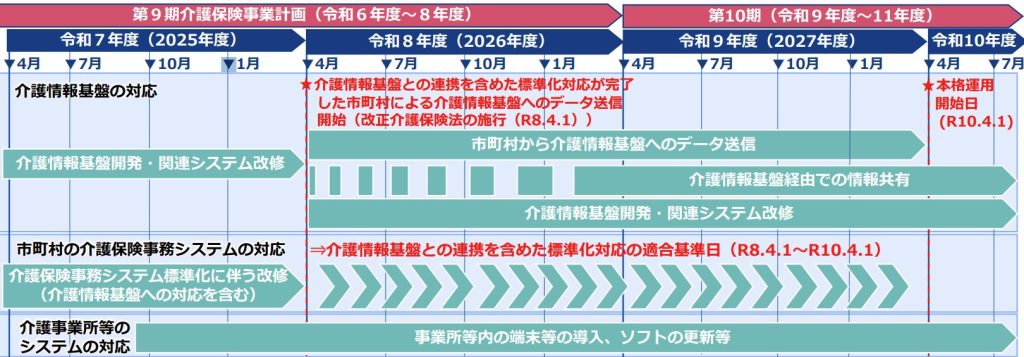 令和8年4月から標準準拠システムへ移行済みの市町村から順次、介護情報基盤の活用が始まり、最終的には令和10年4月までに全国での運用開始を目指します。