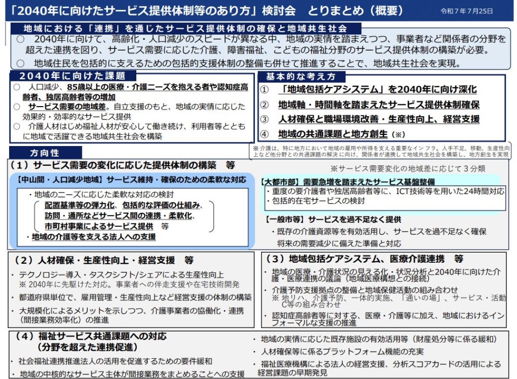 厚生労働省は令和7年7月25日付で、「2040年に向けたサービス提供体制等のあり方に関するとりまとめ」を公表しました。