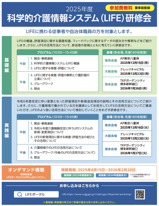 この研修は、介護施設・事業所および自治体職員を対象に、LIFEの基礎理解から実践的活用までを体系的に学ぶことを目的としています。科学的介護の推進と、LIFEデータの効果的な活用を支援する取り組みとして、国立長寿医療研究センターが実施します。